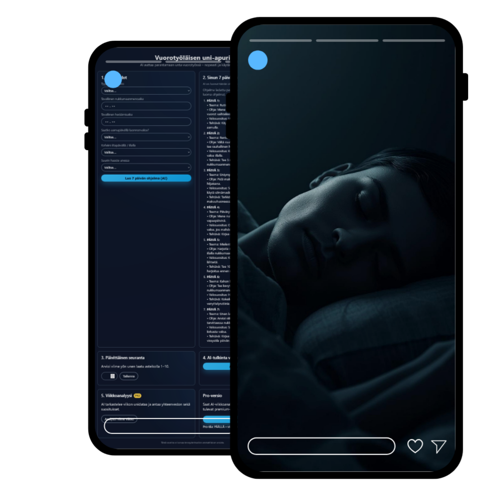 noxAI ei ole yleinen unisovellus. Se on rakennettu ymmärtämään: epäsäännölliset työajat, vaihtuvat unirytmit ja palautumisen haasteet vuorotyössä Ohjaus mukautuu käyttäjän todelliseen arkeen.